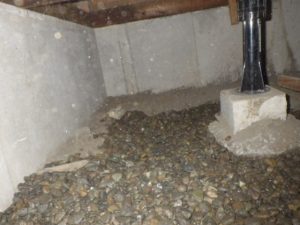 この内、和室の床下では、次の画像のように一部が陥没し、なんと柱が地面から離れていました。